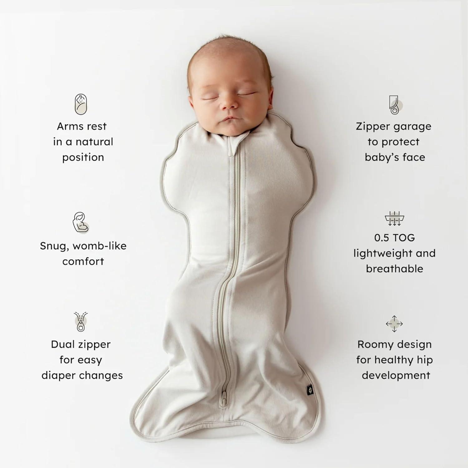 This fuss-free swaddle keeps your baby snug and safe as they adjust from womb to world. Crafted from an ultra soft, breathable rayon made from bamboo fabric with built-in stretch, the swaddle bag is designed to let your little one’s arms rest in a natural, preferred position. No wrapping, tucking, or tricks required—simply open the swaddle bag, place your baby on top with their arms folded across the chest, and zip to close. The lightweight, thermoregulating fabric feels like a gentle hug for comfort and safety, while the hip-friendly design ensures proper development.